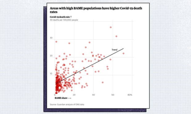 Grafik yüksek azınlık popülasyonuna sahip alanlarda Kovid-19 kaynaklı ölüm oranlarının daha yüksek olduğunu gösteriyor.