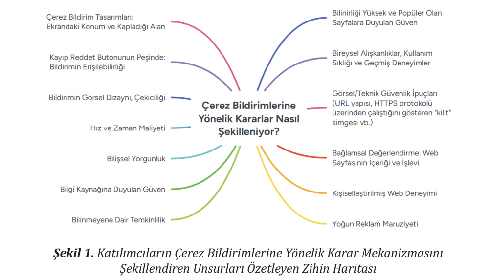 Our article, titled “‘Accept’ or ‘Reject’? A Qualitative Research on Users’ Perceptions and Decision-Making Processes Regarding Cookies,” explores the reflexes, cognitive fatigue, and trust perceptions users develop when encountering cookie notifications. The mind map shared here summarizes the complex interplay of factors influencing participant decisions.